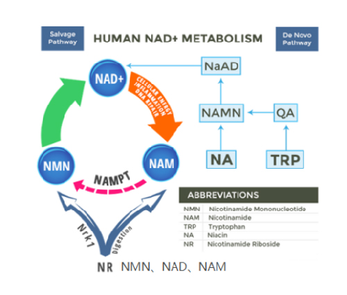 早期使用大鼠腸道的研究得出結論,NAM,NR和NMN都是NAD的可行前體,但是NR和NMN必須首先分解為NAM和其他更簡單的成分,才能被完全消化并吸收到動物體內。一旦進入體內,這些單獨的成分將重新組裝,首先組裝成NR和NMN,然后再轉變成NAD。原因是小腸有時難以吸收更復雜的分子,因此必須首先將其分解為更簡單的成分。對于動物,甚至在較小程度上的人類,都是如此。