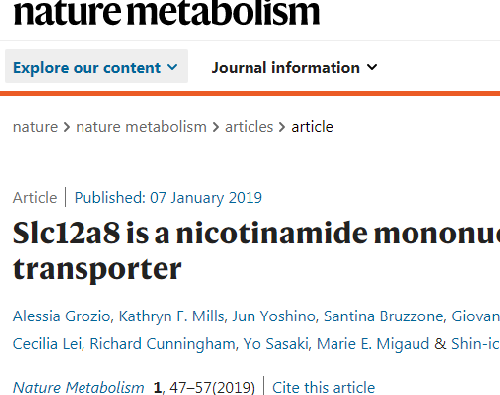 “煙酰胺單核苷酸(NMN)是煙酰胺腺嘌呤二核苷酸(NAD +)的生物合成前體,已知能促進細胞NAD +的產生并抵消與組織NAD +水平下降有關的與年齡相關的病理……在這里,我們顯示Slc12a8基因編碼一個特定的NMN轉運蛋白。我們進一步證明Slc12a8特異性轉運NMN,而不是煙酰胺核糖。