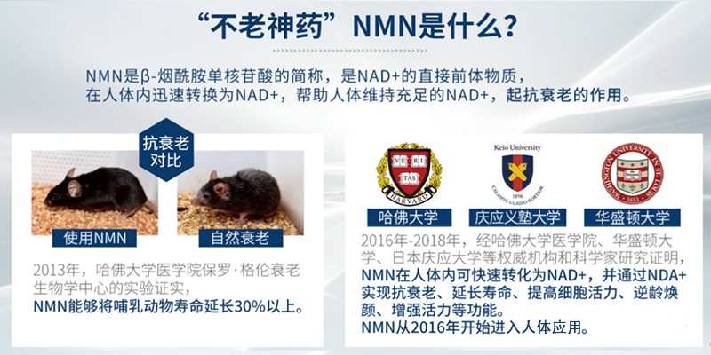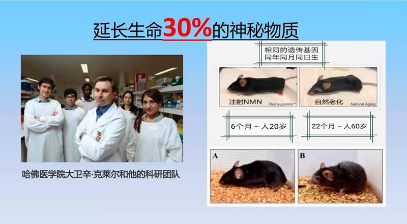 2016年哈佛大學(xué)醫(yī)學(xué)院David Sinclair教授研究發(fā)現(xiàn):相當(dāng)于人類年齡70歲的小鼠服用NMN一周后回到20歲的狀態(tài),并且壽命延長了20%。