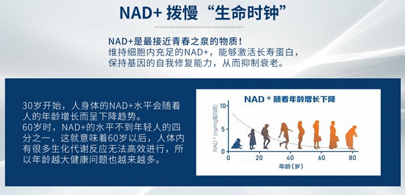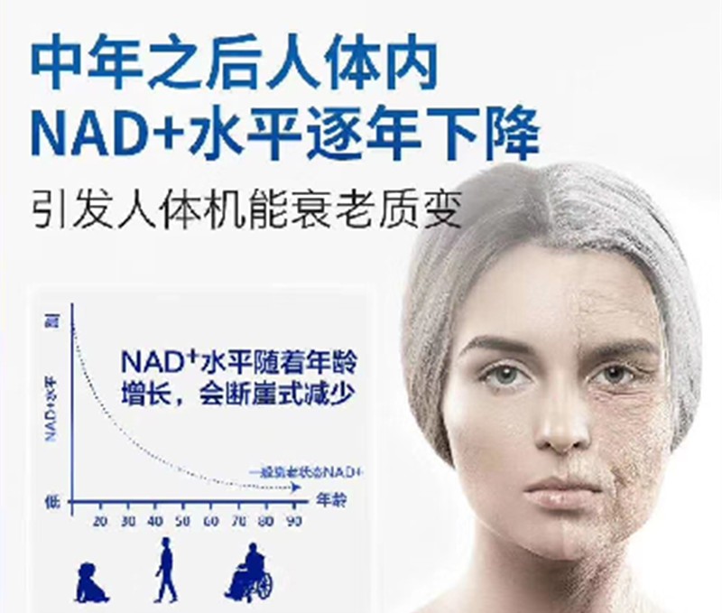 隨著年齡增長,人體內(nèi)NAD+水平下降,導(dǎo)致線粒體功能減退,觸發(fā)衰老和各種功能性疾病。