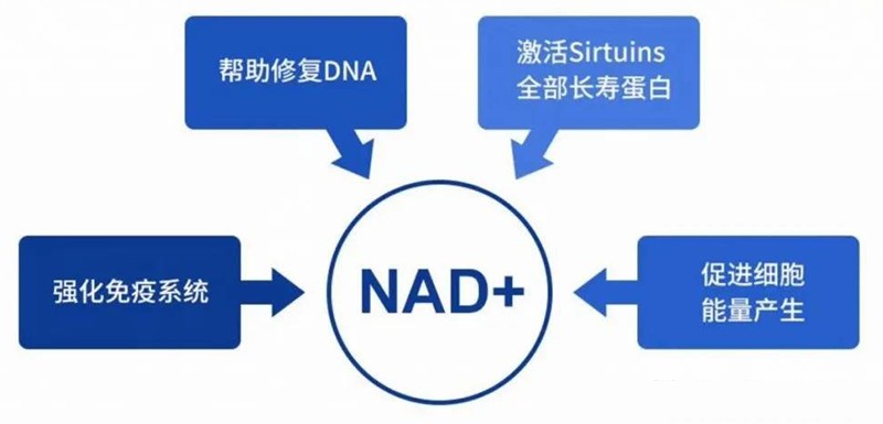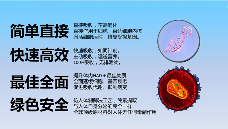 NAD+可以修復(fù)線粒體,修復(fù)DNA,激活人體長壽基因,能催化產(chǎn)生95%的生命能量。