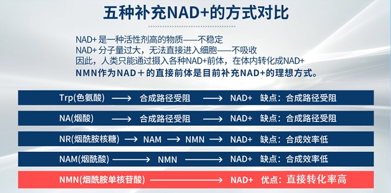 NMN是NAD+的前體,在體內(nèi)快速生成NAD+,NMN是增加NAD+最好的方式。