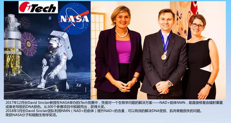 由于NMN修復(fù)太空輻射損傷的DNA和恢復(fù)失重下骨骼肌損失的作用,NASA在2016和2018年兩次為NMN研究的領(lǐng)軍人物David Sinclair教授頒獎。